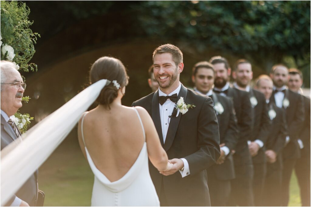 The black tie dress code was impeccably adhered to by all the guests, adding an extra layer of elegance to the day. Nicole’s dress, designed by Made With Love, was a stunning sight to behold. Each intricate detail was captured beautifully against the classic backdrop of Kohl Mansion. The bridesmaids, dressed in BHDLN, complemented the high-end feel of the celebration.